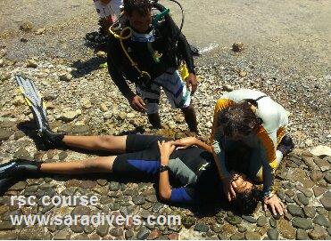 EFRコースはダイビングに限らず、生活の中で起こりうる事故や病気怪我などの緊急事態に対応する知識と技術を習得します。マネキンを使って心配蘇生法(CPR)の練習もします。